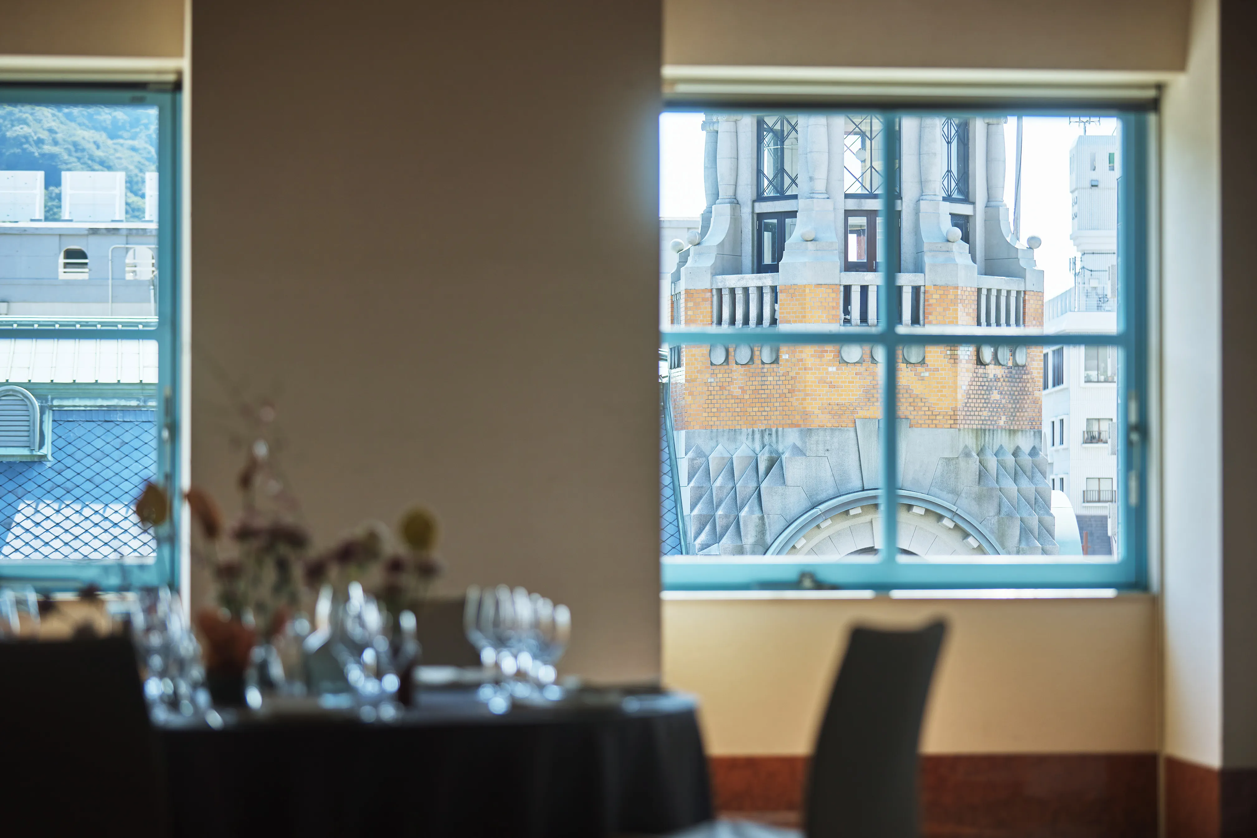 開放感が溢れる大きな窓のパーティ会場からは重要文化財
