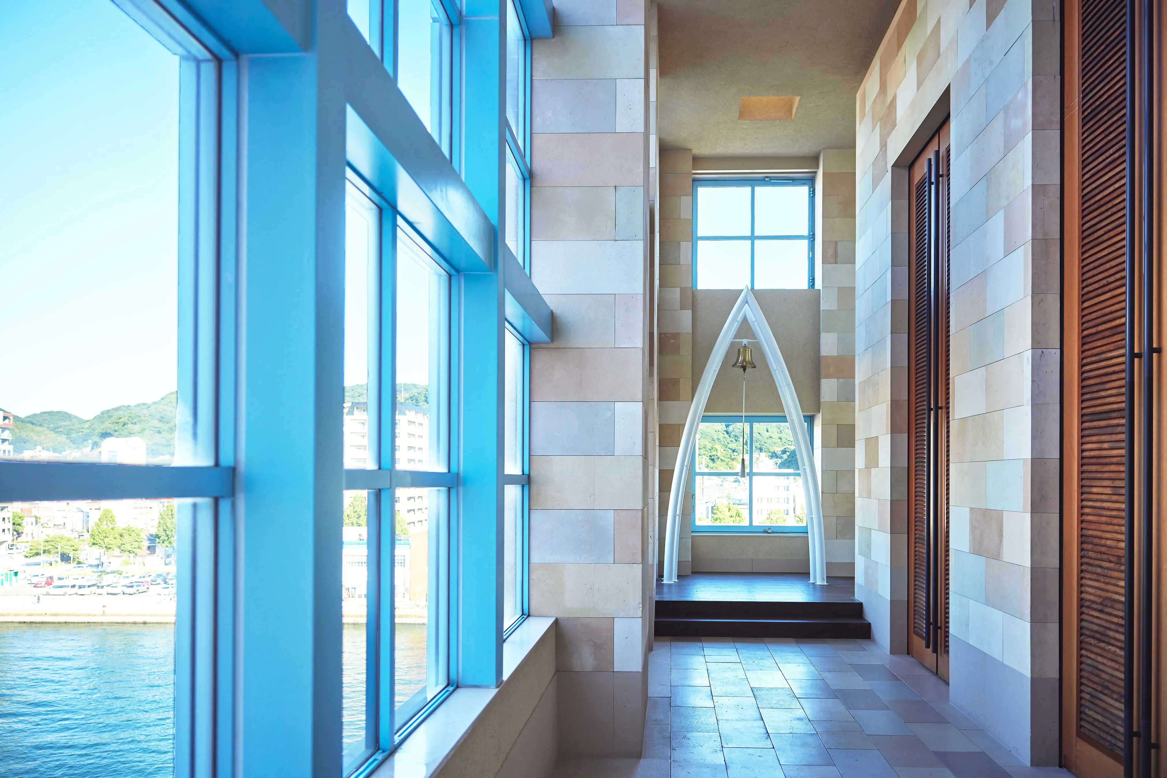 祭壇の先に広がる青い空と光のアーチ